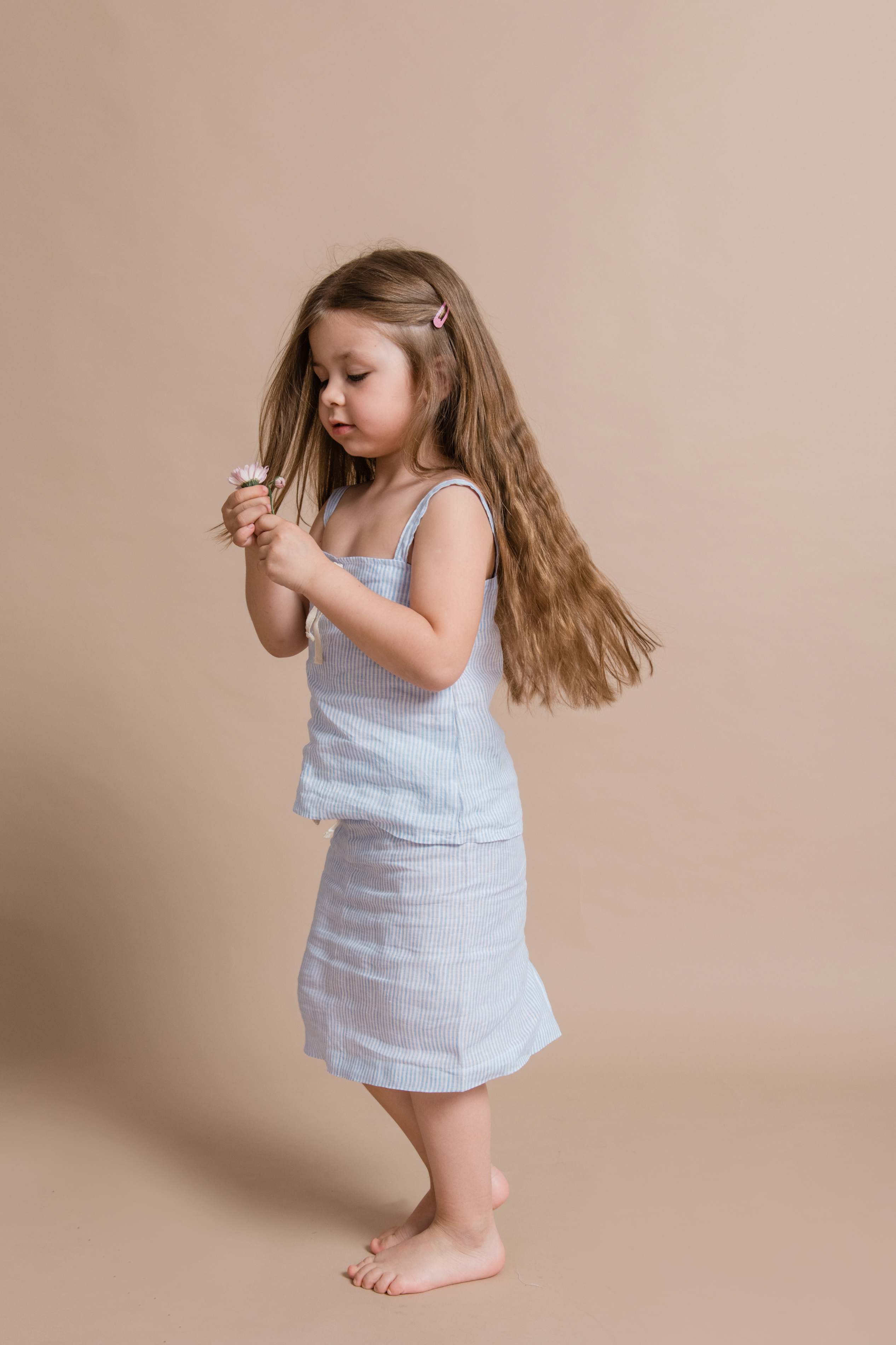 Svako je ljeto ispunjeno pričama. Svakodnevne stvari poput kamenčića ili naplavljenog drveta u tren oka postanu dvorci i zmajevi. U ovoj lepršavoj suknji ukrašenoj sa slatkom mašnicom vaša će djevojčica uživati u šetnji, izmišljajući nove priče. Nakon dugog razigranog poslijepodneva na plaži ili u vrtu, ova svestrana suknja odlična je za šetnju gradom uz sladoled. Suknja ima izdržljiv pojas i idealno se kombinira s Novella topom bez rukava.