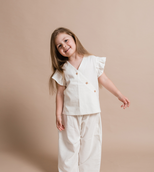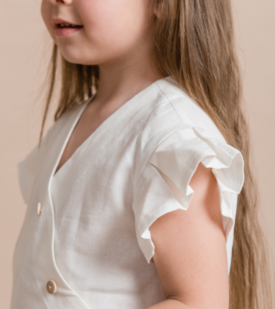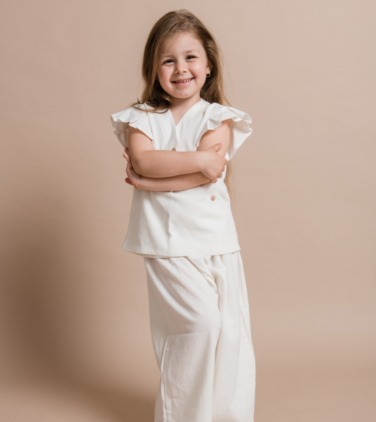Ljeta su stvorena za lov na nove avanture u odjeći koja leprša na povjetarcu. Ova bluza bez rukava s volanima dizajnirana je za susrete pune igre, ali i dovoljno elegantna za rođendane i večernje šetnje uz more. Košulja ima volane s tamno sivim prugama i gumbe sa sedefastim ukrasom. Bluzu uparite s Marinaia hlačama širokih nogavica s elastičnim rubom.
