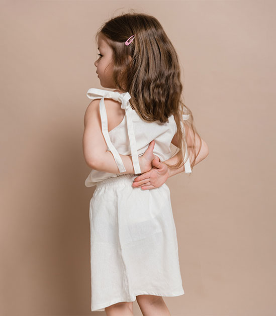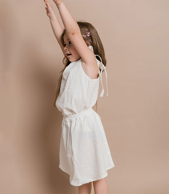 Svakom djetetu potrebna je sloboda igranja i istraživanja. Svaki korak treba biti lak kao perce. Svaka ideja može postati stvarnost tijekom dugih ljetnih popodneva. Ova suknja A kroja pruža dovoljno prostora i lakoće za svaki korak vaše male istraživačice. Suknja ima široki izdržljivi pojas. Uparite je s Essenza topom s trakama za vezivanje.